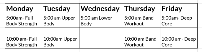 *All workouts will have modifications incorporated. Schedule is subject to change.